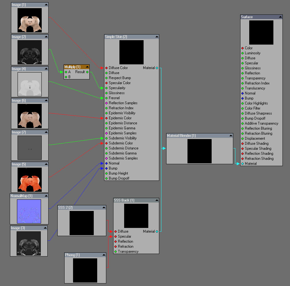 To get a bit more control over the back lit Subsurface Scattering I mixed up the Simple Skin material with an extra SSS 2 node. I think the new SSS nodes in LightWave are fantastic, good quality and fast rendering. I also ended up using an SSS 2 node when I created the node network for the eyeball shading.